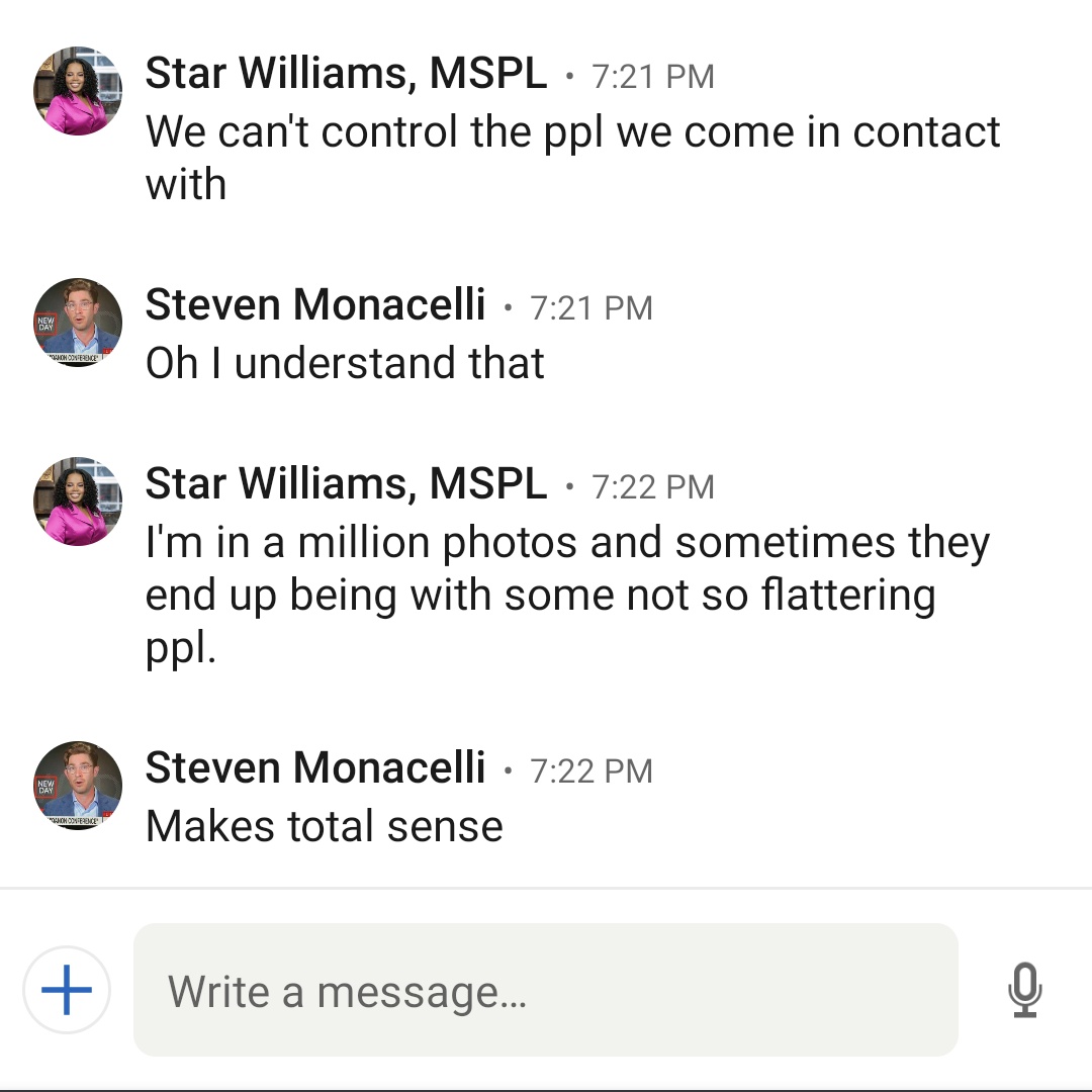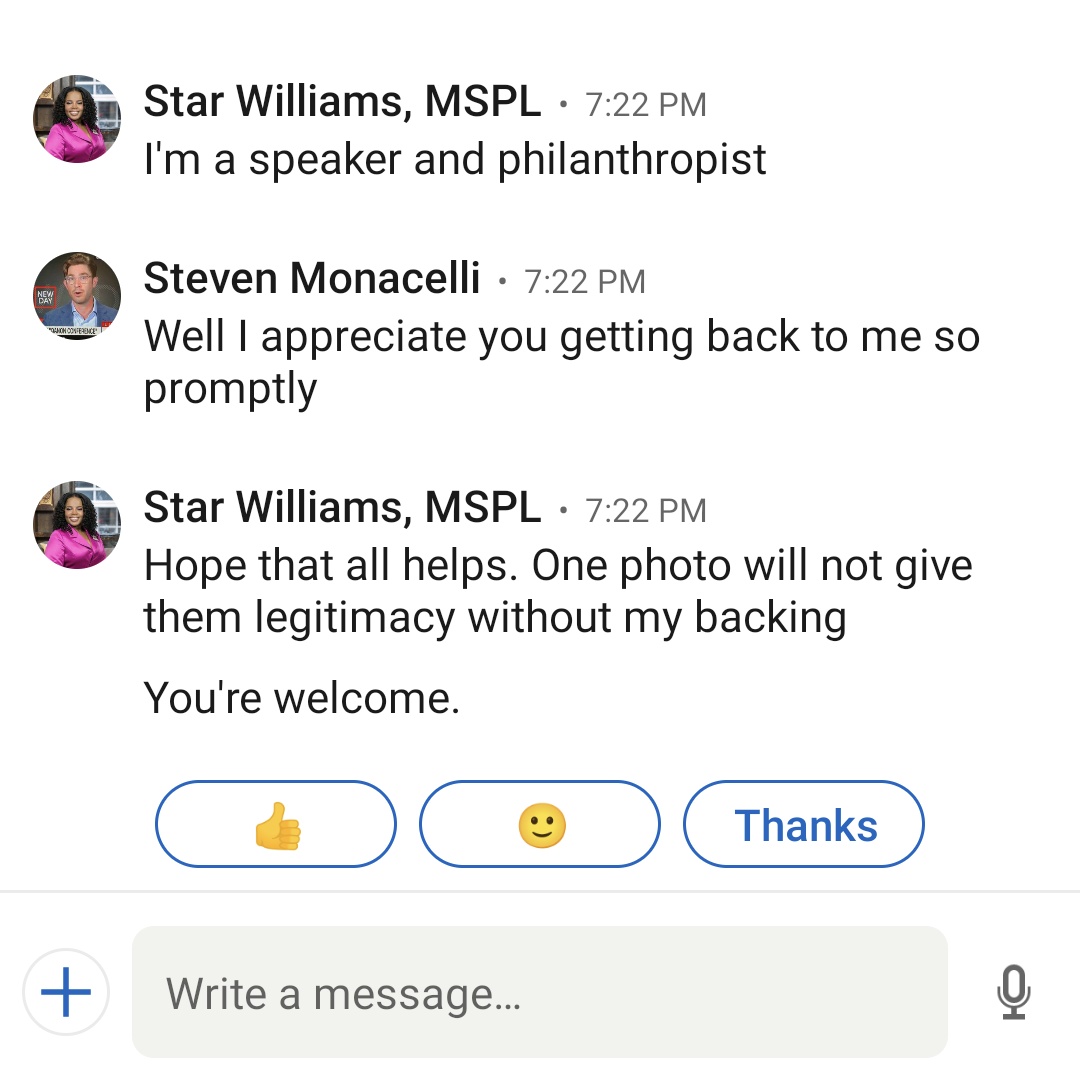 The strange saga continues. Mrs. Star Williams does not endorse the framing of this photo which was taken at a public event.