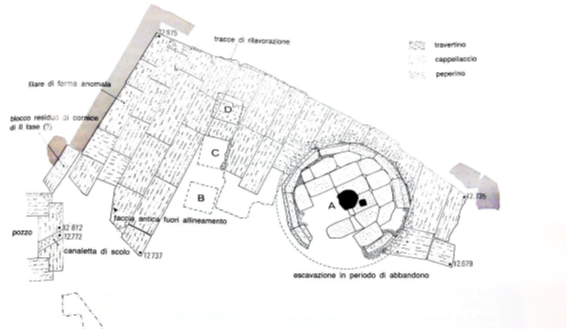 Giuliani y Verduchi (1987: 109) señalan que en una fase tardorepublicana el nivel del pavimento del monumento con el objetivo de drenar y evitar el estancamiento de agua. Por tanto, sea cual sea la teoría aceptada, su relación con el agua es indiscutible.