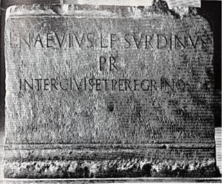 En el reverso de la estela hay una inscripción que dice: L (ucius) NAEVIUS L (uci) F (ilius) SURDINUS / PR (aetor) / INTER CIVIS ET PEREGRINOS. Este mismo nombre aparece en el pavimento del foro cercano al Lacus Curcius.