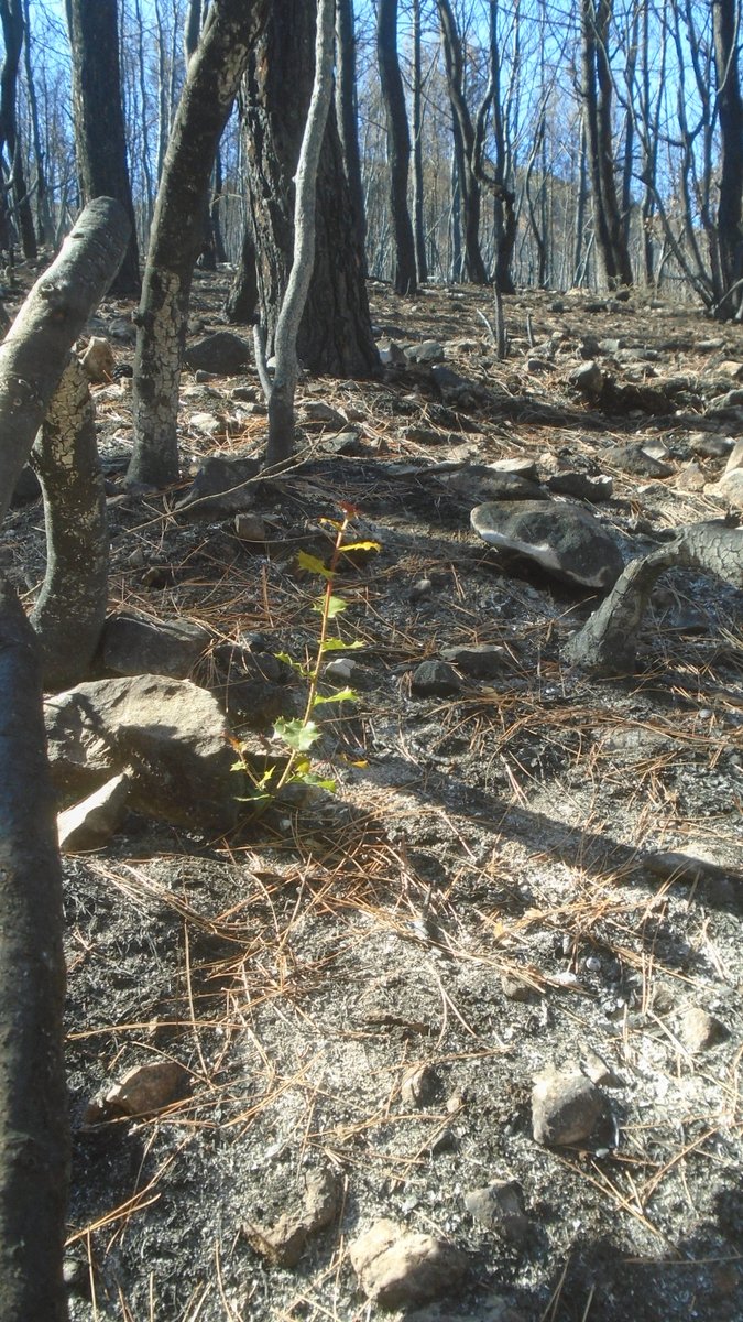 Κι όμως. Μόλις ένα μήνα και μισή... βροχή μετά, τα πουρνάρια άρχισαν να πετάνε μέσα απ' την καμένη γη τα νέα βλαστάρια τους! Η αναγέννηση ξεκίνησε ήδη αθόρυβα και διακριτικά. Η ζωή ξαναπαίζει κιόλας το δράμα της. 4/5