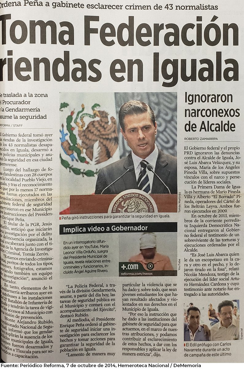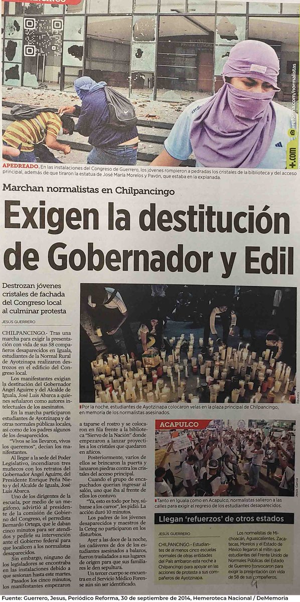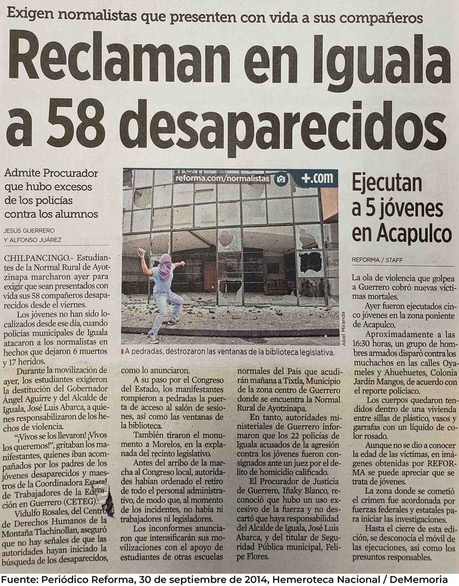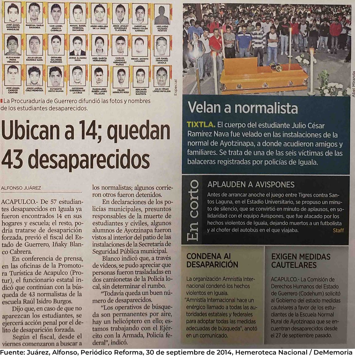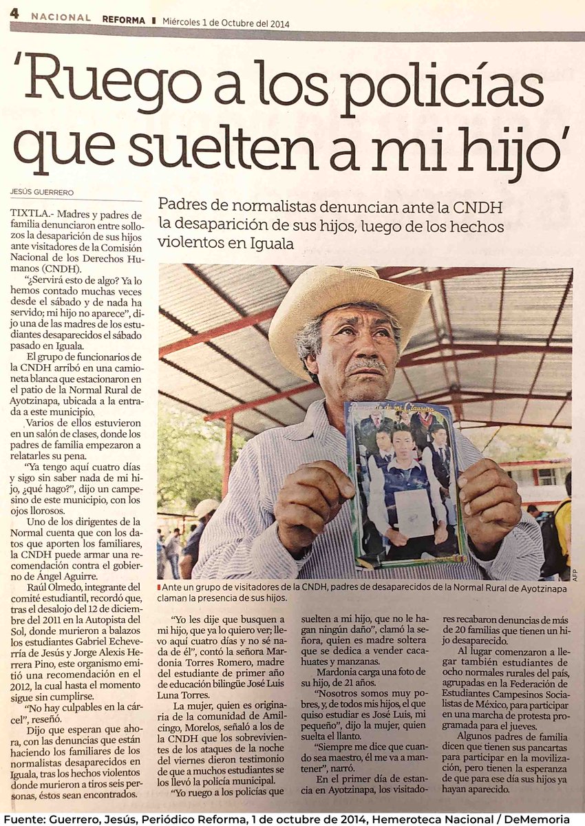 Los padres de los desaparecidos iniciaron la larga búsqueda de sus hijos y durante octubre y noviembre de 2014 se dieron protestas en Guerrero y la Ciudad de México en demanda de la presentación de los 43 normalistas.