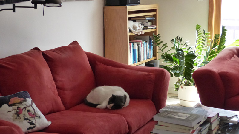 Ric let me take off his harness. I gave him coming-in treats, and he was pleased. Zooey is still looking out the window, but I didn't see or hear anything.