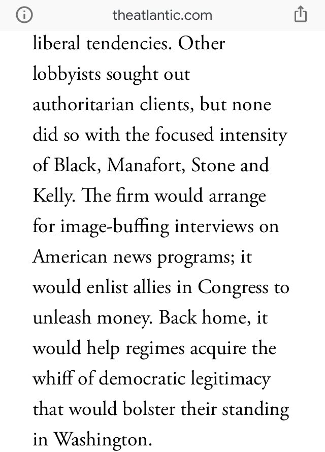 @arapaho415@TeresaCCarter2@insiderfilms1@sisu_sanity@clearing_fog@TheAtlantic To get it, they needed help refining their image, so that Congress wouldn’t look too hard at their less-than-liberal tendencies. Other lobbyists sought out authoritarian clients, but none did so with the focused intensity of Black, Manafort, Stone and Kelly.