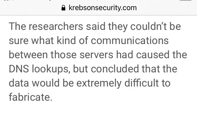 The researchers said they couldn’t be sure what kind of communications between those servers had caused the DNS lookups, but concluded that the data would be extremely difficult to fabricate.