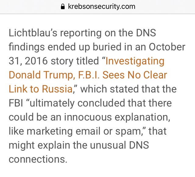 Lichtblau’s reporting on the DNS findings ended up buried in an October 31, 2016 story titled “Investigating Donald Trump, F.B.I. Sees No Clear Link to Russia,” which stated that…