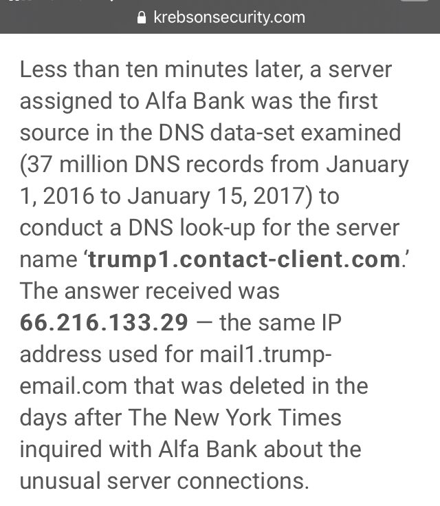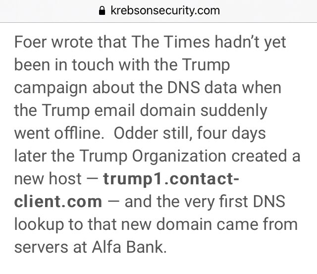 Odder still, four days later the Trump Organization created a new host — trump1.contact-client.com — and the very first DNS lookup to that new domain came from servers at Alfa Bank. 🔥🔥