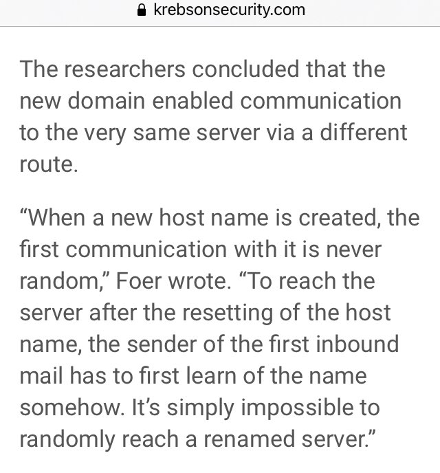 “When a new host name is created, the first communication with it is never random,” Foer wrote. “To reach the server after the resetting of the host name, the sender of the first inbound mail has to first learn of the name somehow…