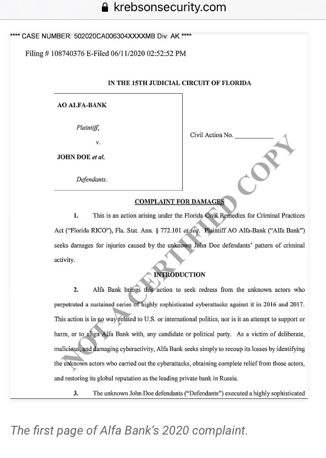 The first page of Alfa Bank’s 2020 complaint.
