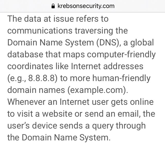 The data at issue refers to communications traversing the Domain Name System (DNS), a global database that maps computer-friendly coordinates like Internet addresses (e.g., 8.8.8.8) to more human-friendly domain names (example.com).