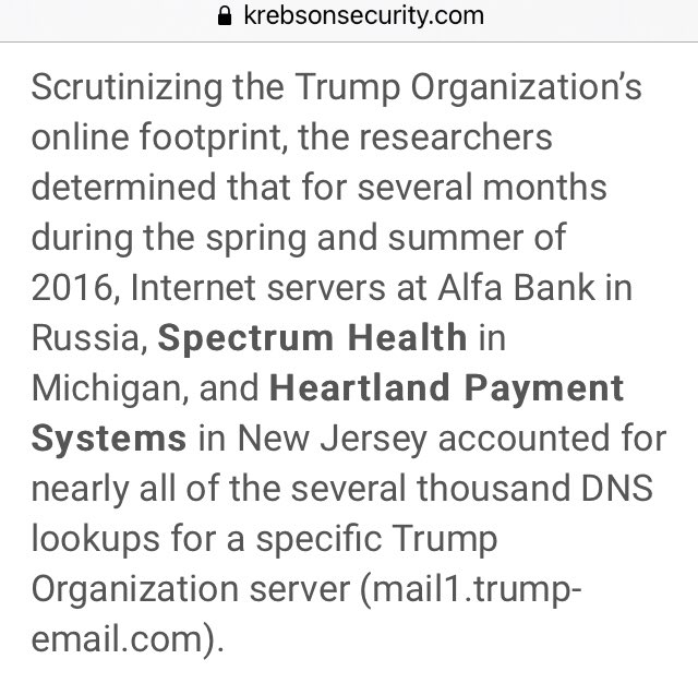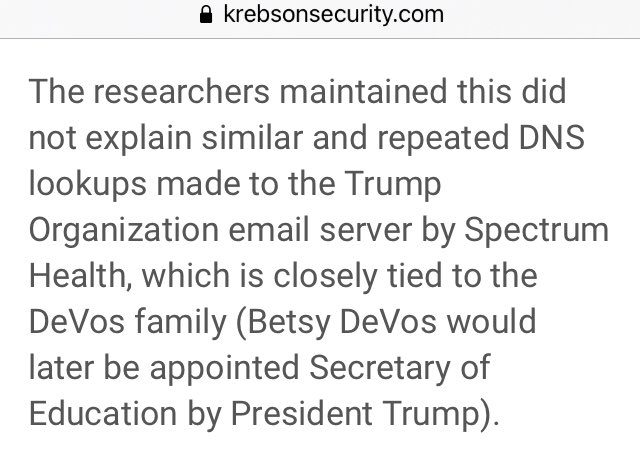 The researchers maintained this did not explain similar and repeated DNS lookups made to the Trump Organization email server by Spectrum Health, which is closely tied to the DeVos family (Betsy DeVos would later be appointed Secretary of Education by President Trump).