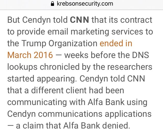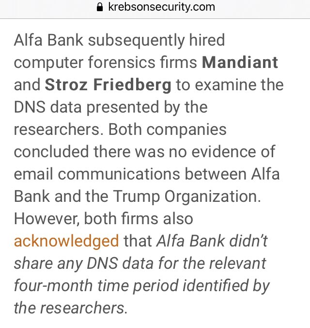 Both companies concluded there was no evidence of email communications between Alfa Bank and the Trump Organization. ➡️ However, both firms also acknowledged that Alfa Bank didn’t share any DNS data for the relevant four-month time period identified by the researchers. 🔥🔥🔥