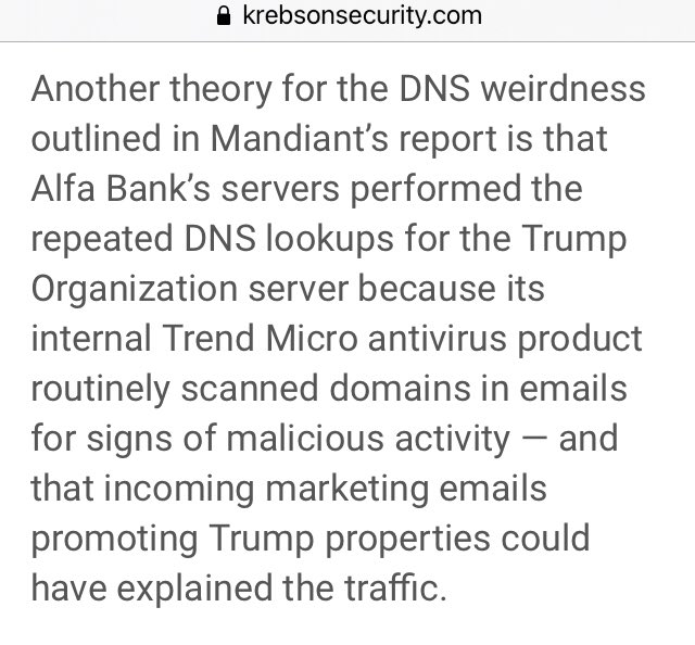 Another theory for the DNS weirdness outlined in Mandiant’s report is that Alfa Bank’s servers performed the repeated DNS lookups for the Trump Org server because its internal Trend Micro antivirus product routinely scanned domains in emails for signs of malicious activity…