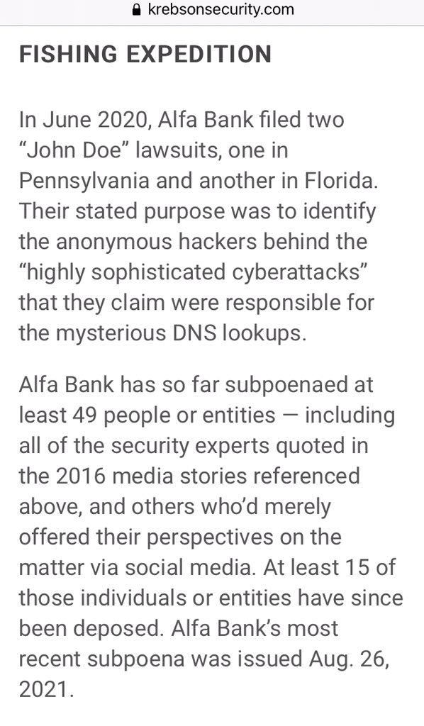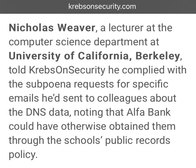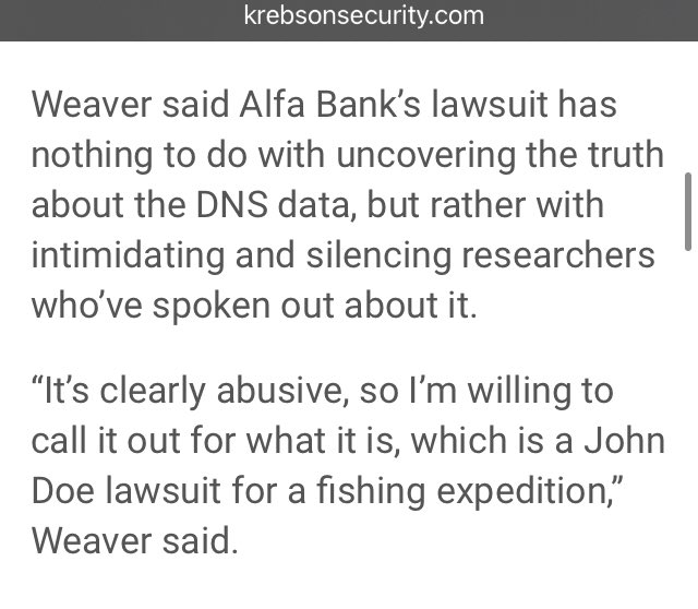 Weaver said Alfa Bank’s lawsuit has nothing to do with uncovering the truth about the DNS data, but rather with intimidating and silencing researchers who’ve spoken out about it. 🎯🎯🎯