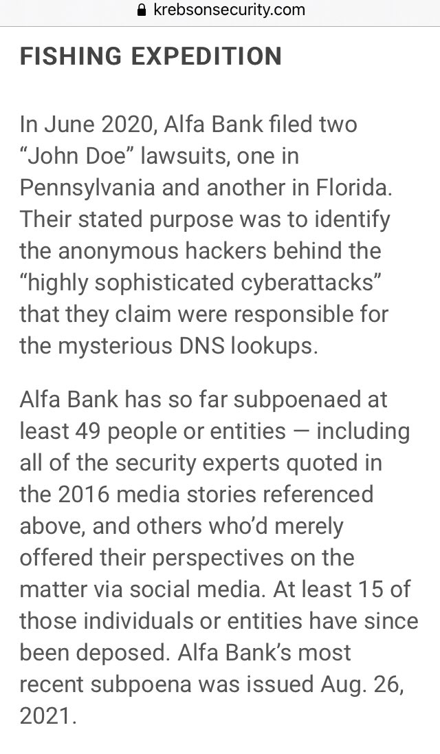 Alfa Bank has so far subpoenaed at least 49 people or entities — including all of the security experts quoted in the 2016 media stories referenced above, and others who’d merely offered their perspectives on the matter via social media.