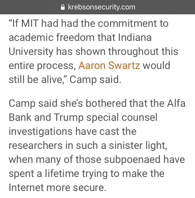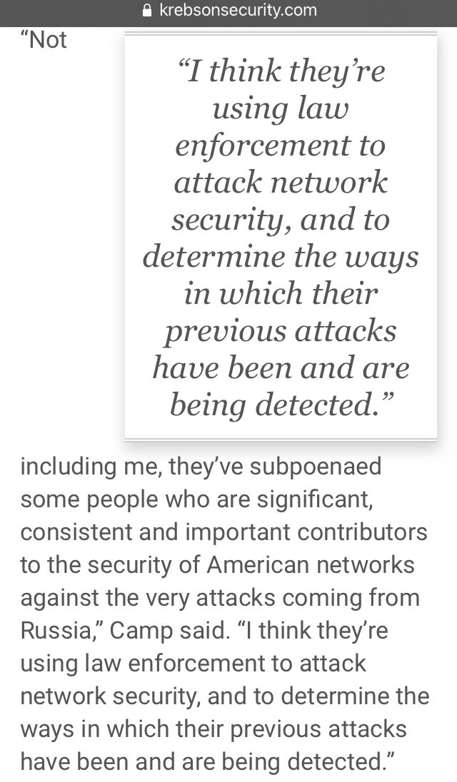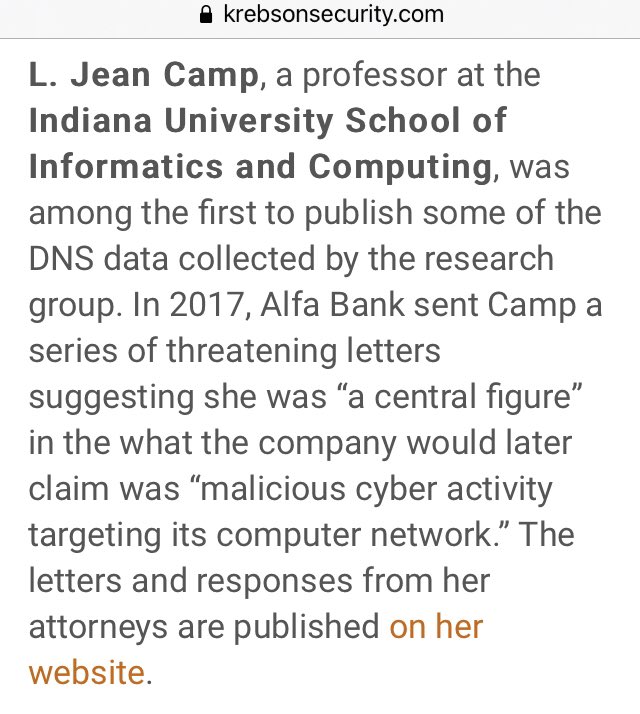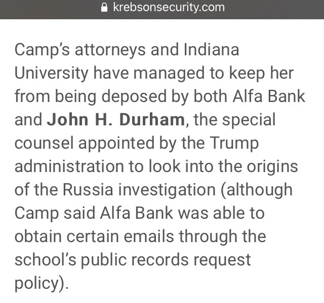 Camp said she’s bothered that the Alfa Bank and Trump special counsel investigations have cast the researchers in such a sinister light, when many of those subpoenaed have spent a lifetime trying to make the Internet more secure. 🎯🎯