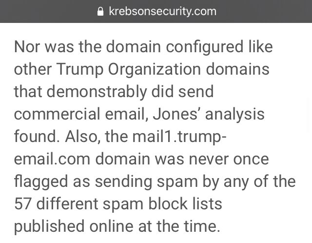 Also, the mail1.trump-email dot com domain was never once flagged as sending spam by any of the 57 different spam block lists published online at the time.