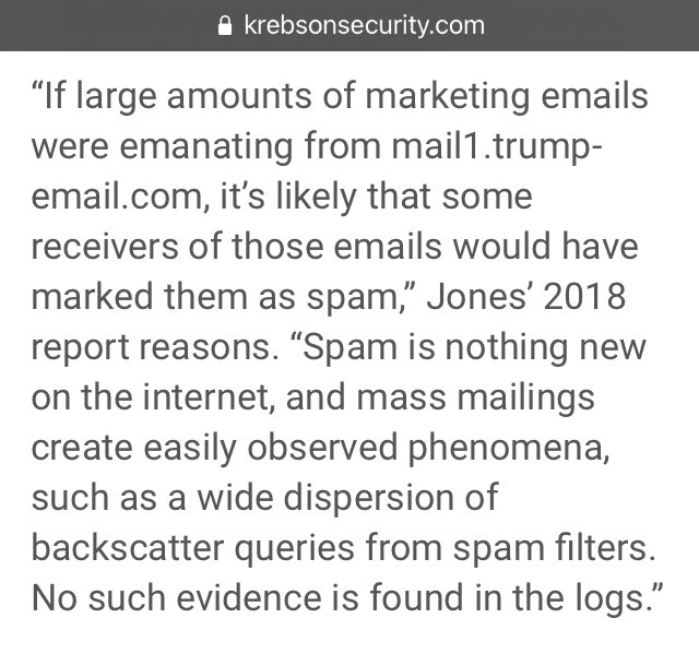 “If large amounts of marketing emails were emanating from mail1.trump-email dot com, it’s likely that some receivers of those emails would have marked them as spam,” Jones’ 2018 report reasons.