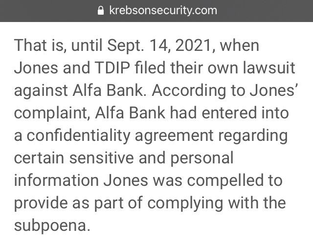 According to Jones’ complaint, Alfa Bank had entered into a confidentiality agreement regarding certain sensitive and personal information Jones was compelled to provide as part of complying with the subpoena.
