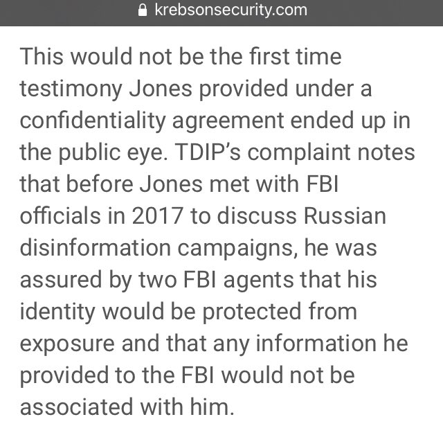 TDIP’s complaint notes that before Jones met with FBI officials in 2017 to discuss Russian disinformation campaigns, he was assured by two FBI agents that his identity would be protected from exposure & that any information he provided to the FBI would not be associated with him.