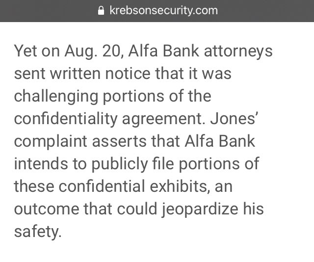 Yet on Aug. 20, Alfa Bank attorneys sent written notice that it was challenging portions of the confidentiality agreement. Jones’ complaint asserts that Alfa Bank intends to publicly file portions of these confidential exhibits, an outcome that could jeopardize his safety.