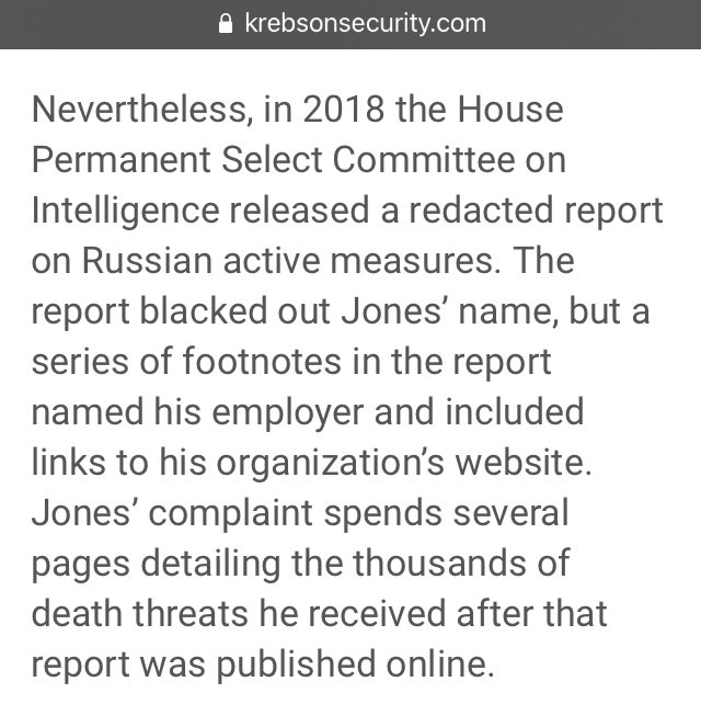 Nevertheless, in 2018 the House Permanent Select Committee on Intelligence released a redacted report on Russian active measures. The report blacked out Jones’ name, but a series of footnotes in the report named his employer and included links to his organization’s website.