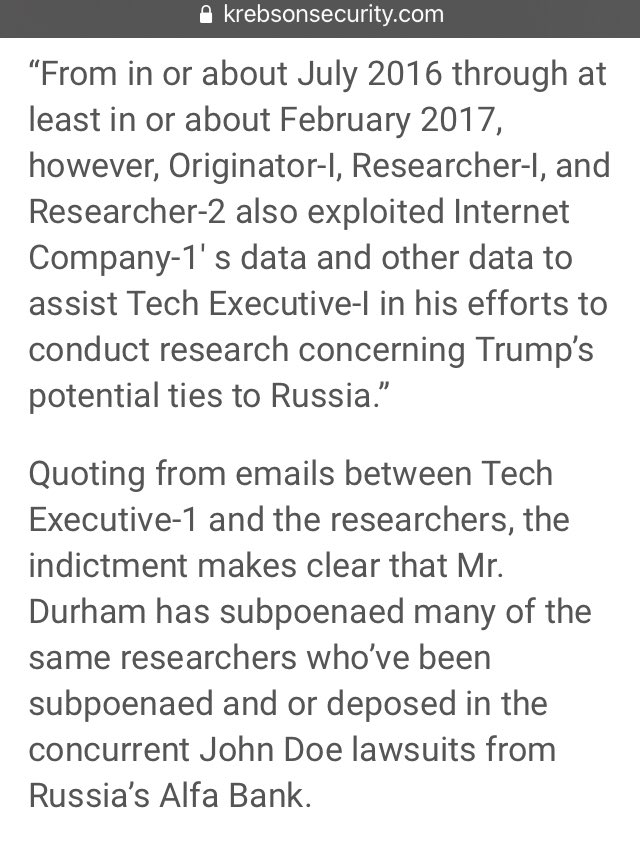 Quoting from emails between Tech Executive-1 and the researchers, the indictment makes clear that Mr. Durham has subpoenaed many of the same researchers who’ve been subpoenaed and or deposed in the concurrent John Doe lawsuits from Russia’s Alfa Bank.