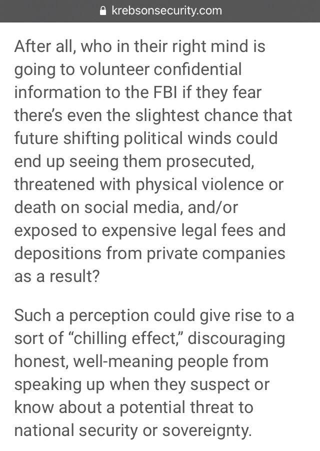 After all, who in their right mind is going to volunteer confidential information to the FBI if they fear there’s even the slightest chance that future shifting political winds could end up seeing them prosecuted, threatened with physical violence or death on social media…