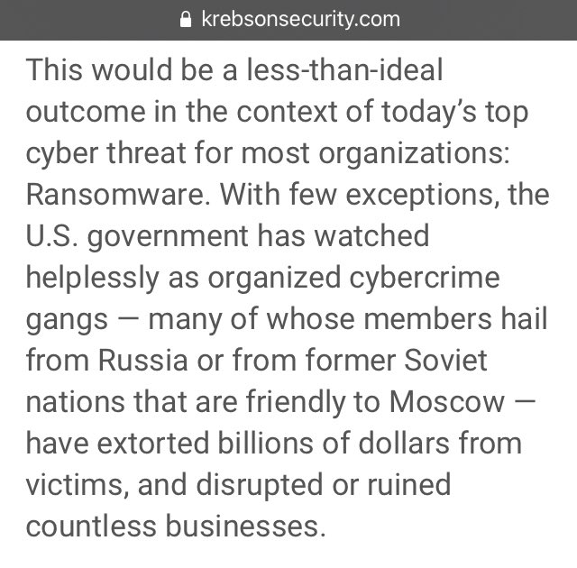 With few exceptions, the U.S. govt has watched helplessly as organized cybercrime gangs - many of whose members hail from Russia or from former Soviet nations that are friendly to Moscow - have extorted billions of dollars from victims, & disrupted or ruined countless businesses.