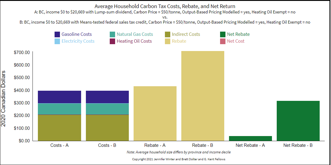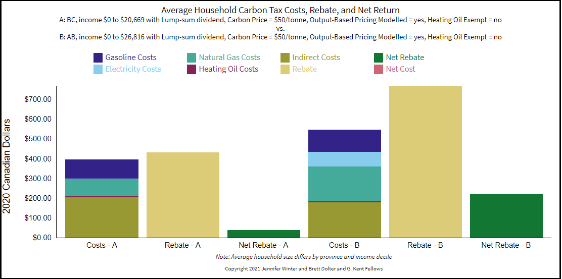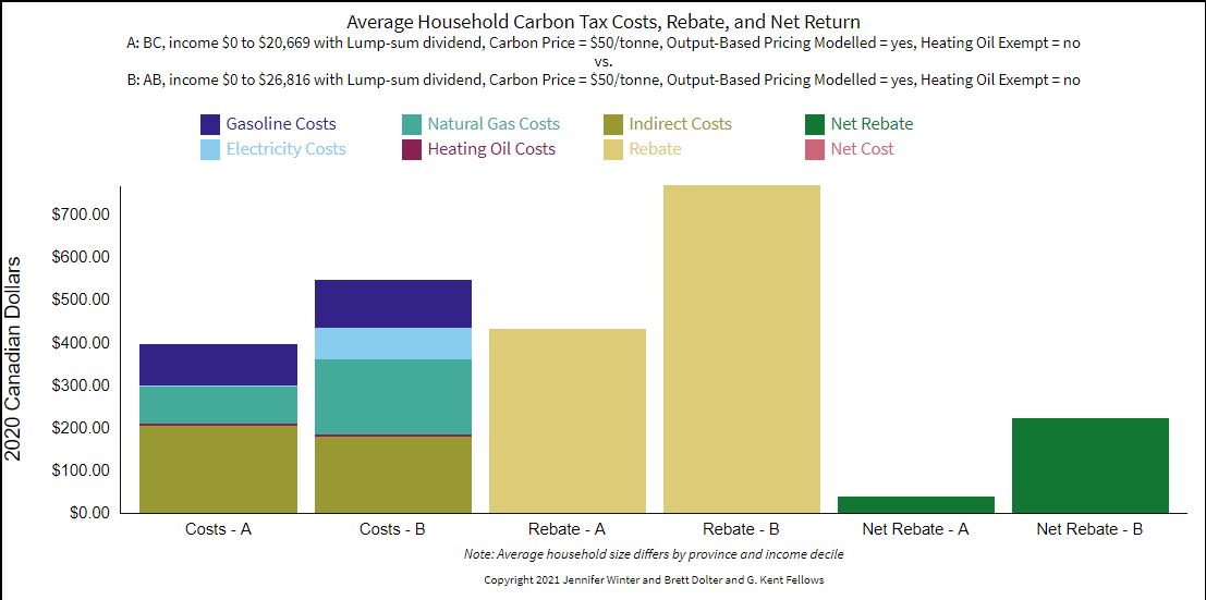 You can also do inter-province comparisons. Here's BC and AB, comparing costs, rebates and net returns for a lump-sum transfer and the lowest income group. 5/?