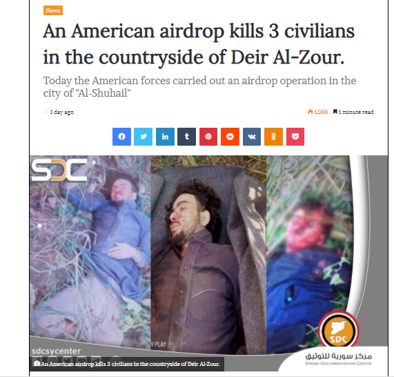 On September 26, the US illegal occupation forces carried out an airdrop operation in the city of “Al-Shuhail” in the eastern countryside of Deir Al-Zour killing 3 civilians from the area. syrcenter.com/en/sdc/12988/a…