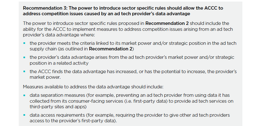 ACCC correctly confirms its concerns lie at the integration of data and competition policy. Data separation measures are key as we're seeing in proposed laws in Europe and US that prevent gatekeepers from misusing market power. I don't think ACCC nailed this area in report. /4