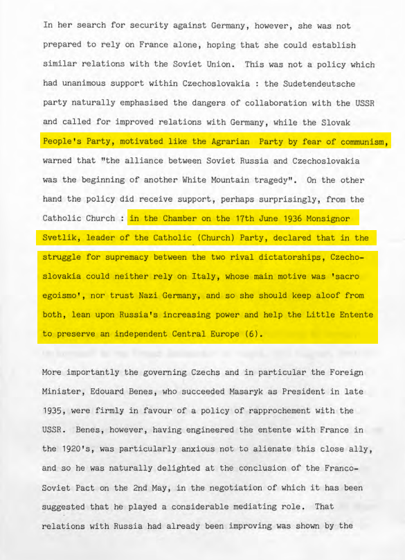 "Msgr. Světlík, vůdce katolické (klerikální) strany, prohlásil ve sněmovně 17. června 1936, že v boji o nadvládu mezi dvěma soupeřícími diktaturami Československo nemůže ... věřit nacistickému Německu."