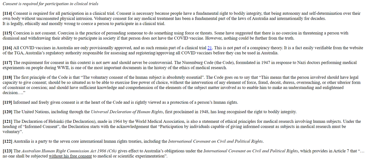 12/ Udział w badaniu klinicznym wymaga zgody, ponieważ ludzie mają prawo do integralności cielesnej, autonomii i samostanowienia nad własnym ciałem bez fizycznej ingerencji bez zgody. Dobrowolna zgoda na leczenie jest od fundamentalną częścią prawa Australii i innych krajów.