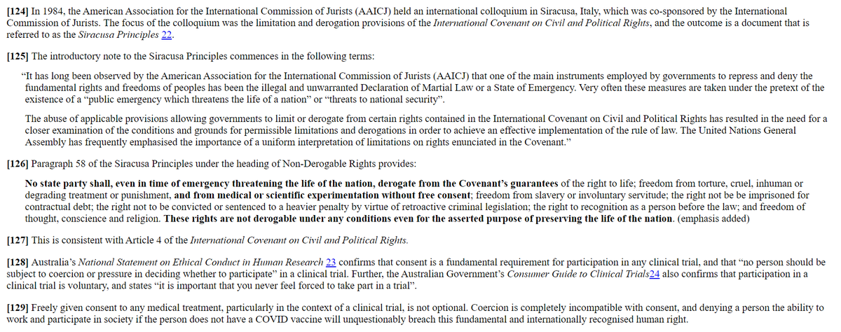 20/ Trybunał przywołuje także: Deklarację Helsińską, Ustawa Australijskiej Komisji Praw Człowieka, Zasady z Syrakuz, art. 4 Międzynarodowego Paktu Praw Obywatelskich i Politycznych i Australijskie Narodowe Oświadczenie w sprawie Etycznego Postępowania w Badaniach na Ludziach
