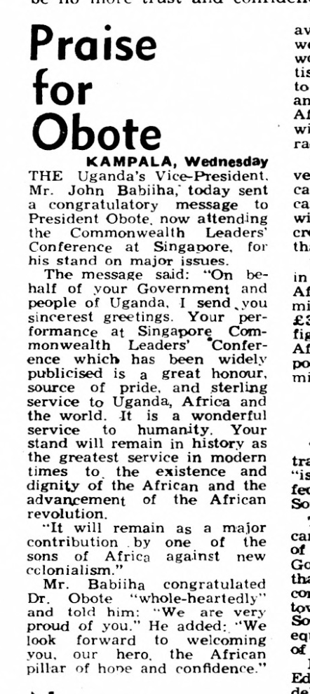 On 21 Jan. 1971--a few days before the govt was overthrown by Idi Amin--VP Babiiha sent a telegram to Milton Obote, who was then in Singapore.
