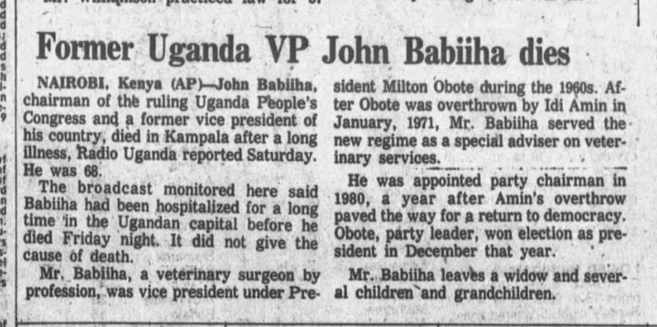 John Babiiha--whose political longevity is possibly unmatched in Uganda's history--passed away in Feb. 1982.