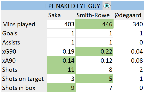 The comparison below shows that Saka tends to take more shots than the other two. But his SoT% is 27.3% whereas ESR holds 62.5%. I'd suggest taking ESR or Saka if you want to pick ARS attacking assets.