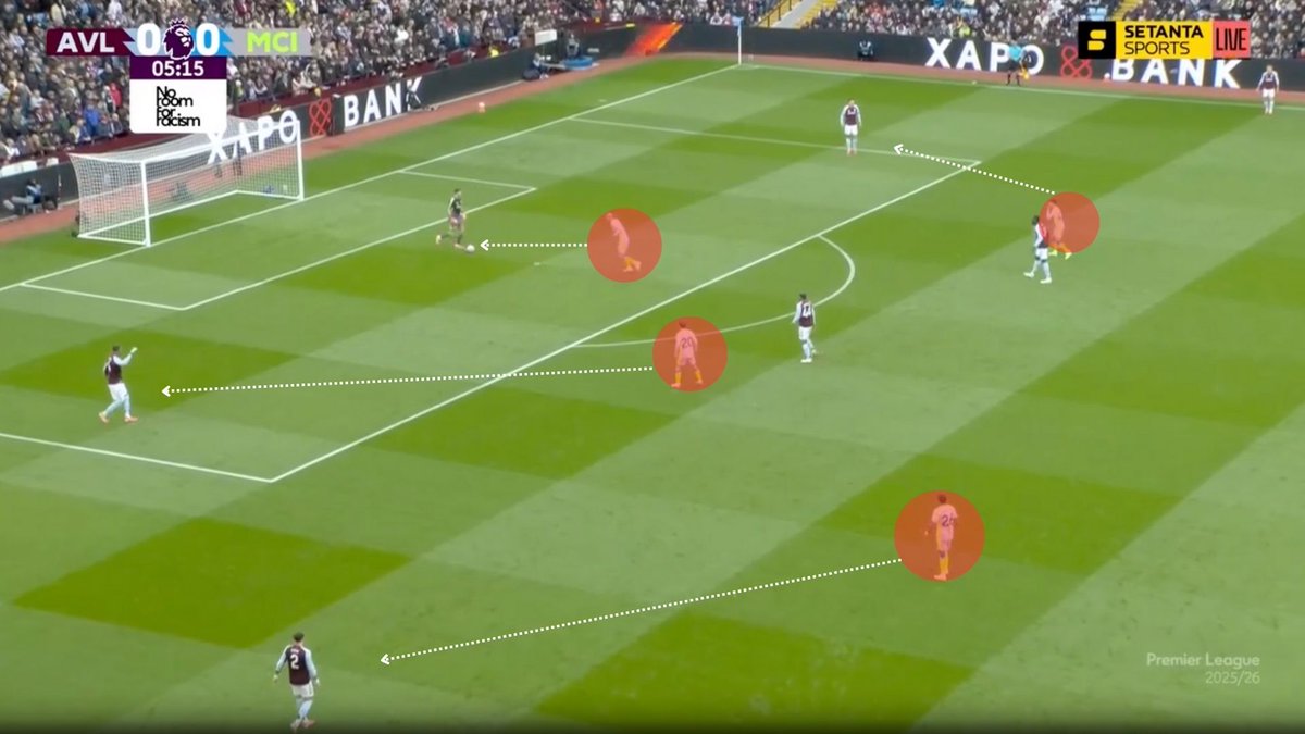 Foden jumps with Bobb focusing on the ball, Digne starts moving forward out wide and receives the pass, Reijnders who’s focused on screening the backline jumps late once Villa bypass the first line of pressure leaving the center open.