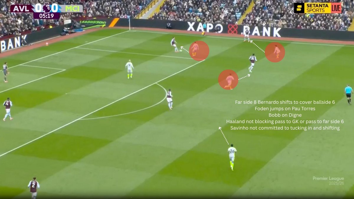 When Villa chose to go down the left through Pau Torres, City shifted with Bernardo shifting to press the ball side 6 (Onana).