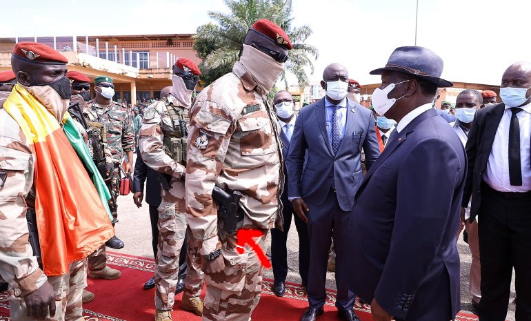 ECOWAS says they want elections within 6 months, and they've already imposed sanctions on the junta. But Doumbouya's stance towards ECOWAS can also be seen as confrontational, exemplified by this photo of him greeting Cote D'Ivoire leader Alassane Ouattara armed with his pistol