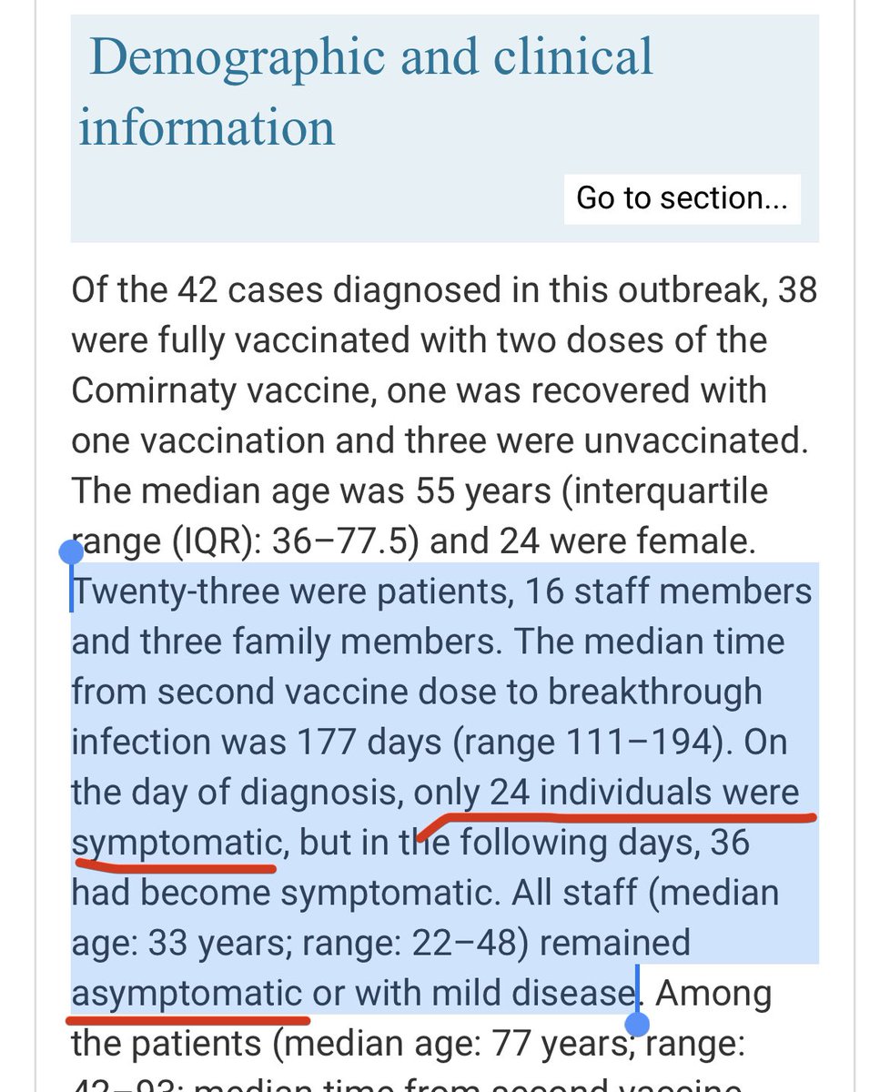 ASYMPTOMATIC BREAKTHROUGH TRANSMISSION? Hospital #COVID19 outbreak in Israel 🇮🇱—38 of 42 were 2-dose Pfizer #vaccinated. On the day of diagnosis, only 24 symptomatic. All infected staff were asymptomatic or mild. This is why we need boosters & still mask. eurosurveillance.org/content/10.280…