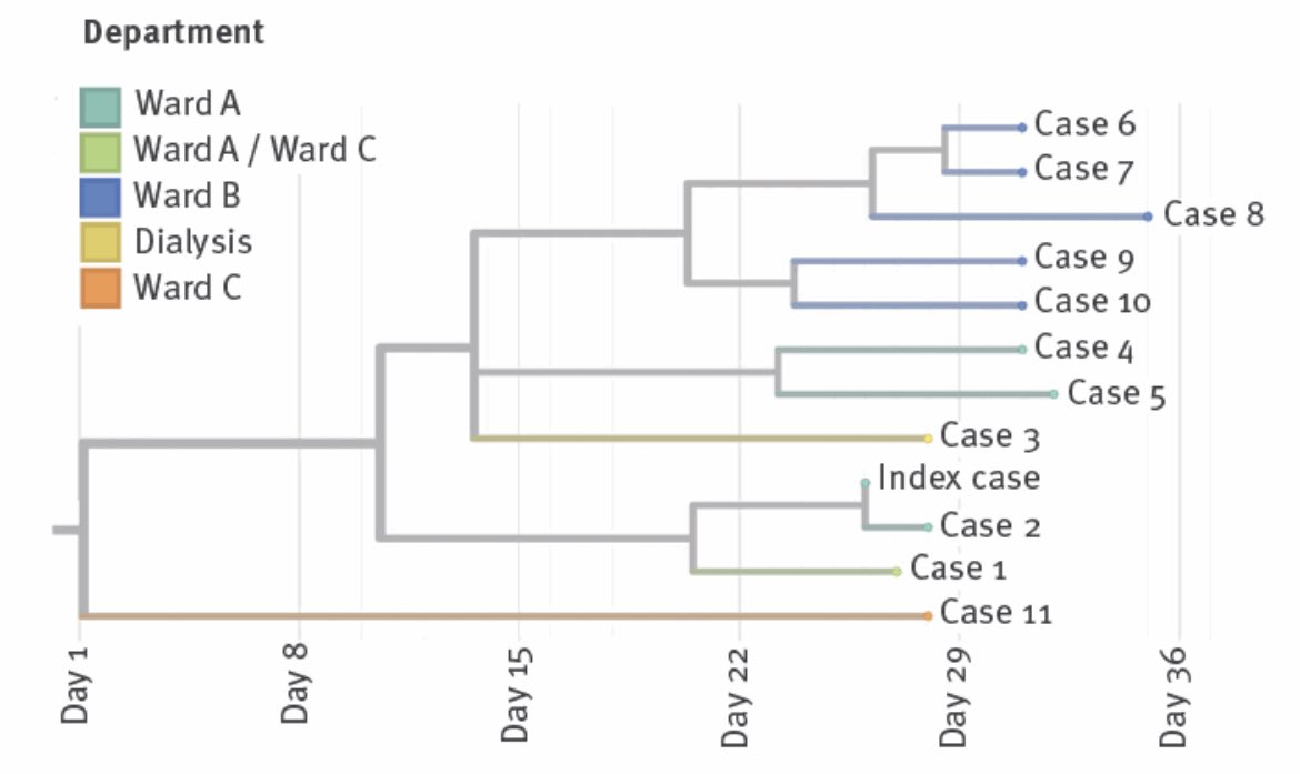2) The calculated attack rate among all exposed patients and staff was 10.6% (16/151) for staff and 23.7% (23/97) for patients, in a population with 96.2% vaccination rate (238 vaccinated/248 exposed individuals).