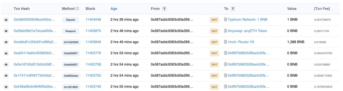 4/x The hacker repeats the above steps seven times and gains in total 1,388 BNBs (with ~$580K). The initial hack funds are transferred from @TyphoonCrypto and the final gains are transferred out to Ethereum via @AnyswapNetwork.