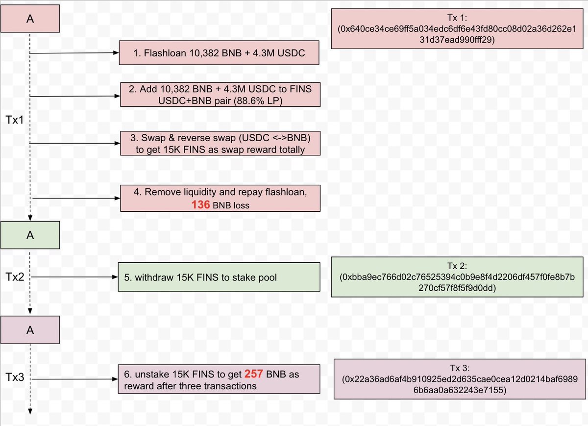 1/x @AutoSharkFin The swap mining feature was exploited in a flurry of txs to gain the reward of 3.18M FINS tokens, which are then immediately swapped to 1,388 BNB (with roughly $581K).