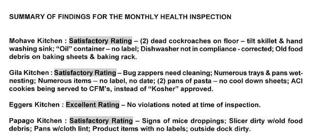 Going through Arizona Department of Corrections food inspections - Kitchens with dead cockroaches and mice droppings get a "Satisfactory" rating - these would be critical violations in any commercial food service facility