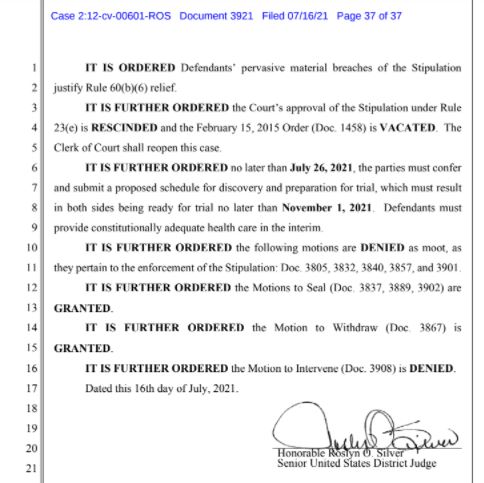 BREAKING: Citing "pervasive material breaches" of Arizona's prison health care class action settlement by the state, Judge Roslyn Silver has ordered the Department of Corrections and prisoner attorneys to prepare for a trial to be held no later than November 1st, 2021