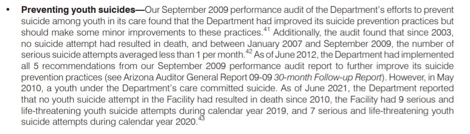 In Arizona's juvenile prison there were "9 serious and life-threatening youth suicide attempts during calendar year 2019, and 7 serious and life-threatening youth suicide attempts during calendar year 2020."