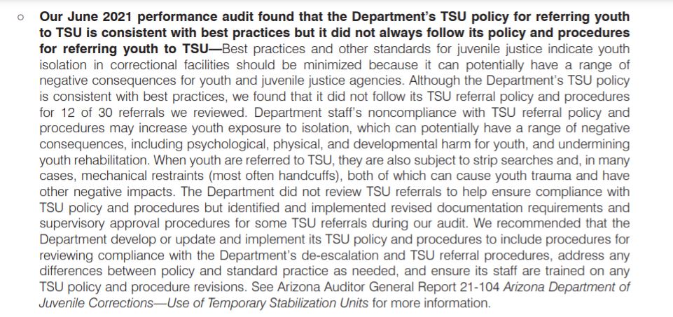 It's incredible to me that auditors keep finding the Arizona Department of Juvenile Corrections is not handling the use of isolation properly, because that very issue has been the focus of TWO previous Federal investigations - It's one of the reasons why ADJC was created