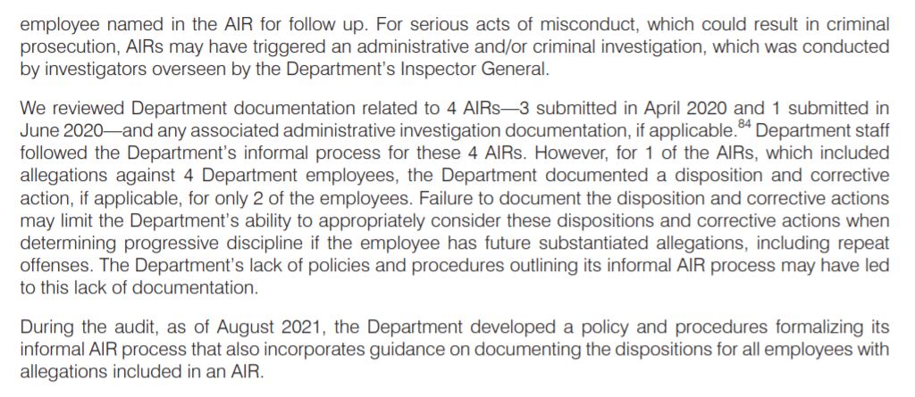 This is an issue I hear about a lot from current and former employees, that basically the Department tries to deal with potential criminal violations "in house" to keep the press off bad stories instead of referring them to an outside agency