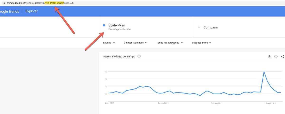 Have you spotted a Topic that is quite relevant for discover and want to see what other topics have been made about it recently? You just need to search for the entity in Google Trends and put it in the parameter kgmid=